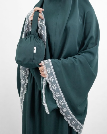 Ensemble de prière 3 pièces, composé d'une jupe taille élastique de 110 cm de longueur, d'un grand hijab à enfiler avec une ouverture de tête extensible qui s'adapte à toutes les formes et tailles de têtes, le haut fait 110 cm de long également il couvre entièrement les bras pendant la Salât et d'une bourse pour ranger l'ensemble lors d'un voyage ou un déplacement.