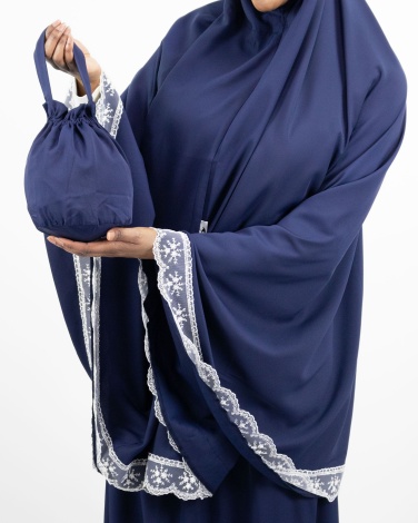 Ensemble de prière 3 pièces, composé d'une jupe taille élastique de 110 cm de longueur, d'un grand hijab à enfiler avec une ouverture de tête extensible qui s'adapte à toutes les formes et tailles de têtes, le haut fait 110 cm de long également il couvre entièrement les bras pendant la Salât et d'une bourse pour ranger l'ensemble lors d'un voyage ou un déplacement.