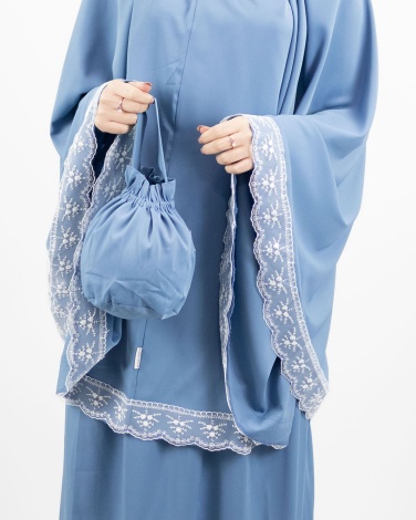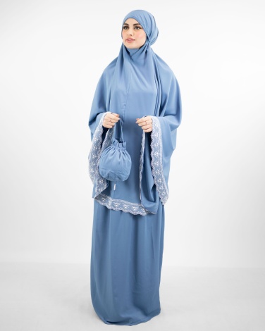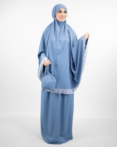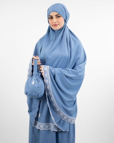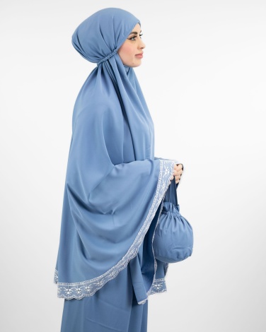 Ensemble de prière 3 pièces, composé d'une jupe taille élastique de 110 cm de longueur, d'un grand hijab à enfiler avec une ouverture de tête extensible qui s'adapte à toutes les formes et tailles de têtes, le haut fait 110 cm de long également il couvre entièrement les bras pendant la Salât et d'une bourse pour ranger l'ensemble lors d'un voyage ou un déplacement.