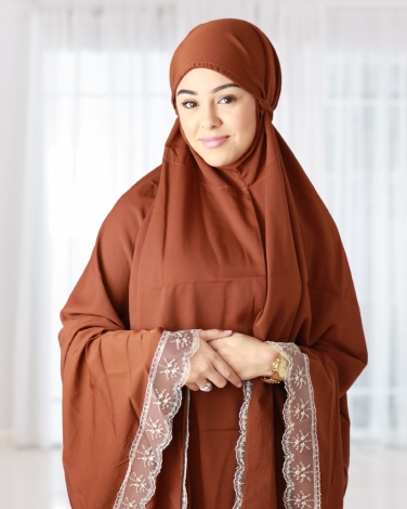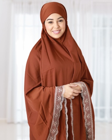 Ensemble de prière 3 pièces, composé d'une jupe taille élastique de 110 cm de longueur, d'un grand hijab à enfiler avec une ouverture de tête extensible qui s'adapte à toutes les formes et tailles de têtes, le haut fait 110 cm de long également il couvre entièrement les bras pendant la Salât et d'une bourse pour ranger l'ensemble lors d'un voyage ou un déplacement.