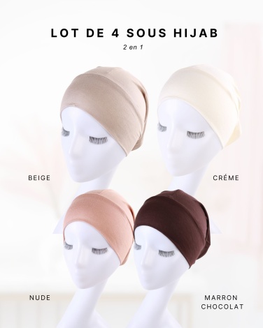 LOT DE 4 SOUS HIJABS 2 EN 1 (SIMPLE OU CROISÉ) : Beige / Créme / Nude / Marron Chocolat