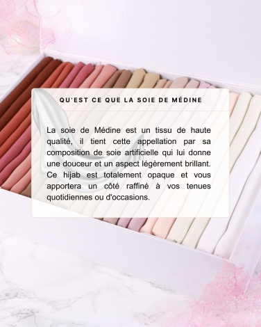 Medina silk hijab is a smooth and pleasant material, made from polyester but also enriched with artificial silk, giving the entire fabric a soft texture. This alternative combines the elegant aesthetics of Medina silk, offering a lightweight, durable, and easy-to-care hijab for a comfortable daily wearing experience.