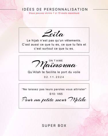 Seize the opportunity to bring exceptional personalization to your gift, adding a distinctive touch that will make it unique and heartfelt. This customization will leave a memorable impression on the veiled Muslim woman who will have the pleasure of receiving it.