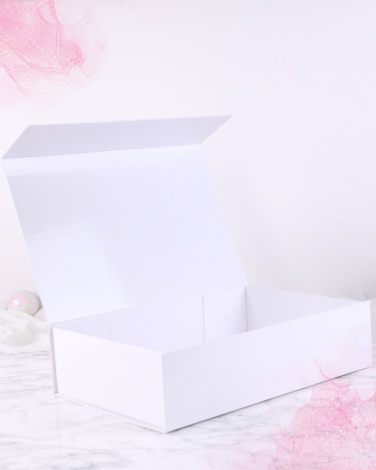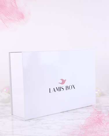 La Box est faite avec du carton rigide recouverte d’un papier pelliculé brillant blanc et d’une fermeture aimantée, belles finitions, intérieur et extérieur de la même couleur.