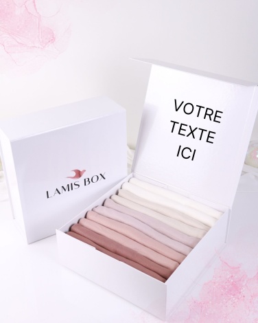 At Lamis Hijab, our commitment to you is reflected in offering the highest quality. Therefore, each product is carefully packaged in a glossy, laminated box, made of first-rate rigid cardboard. We take pride in highlighting that each box is unique, thanks to a customization specially chosen by you.