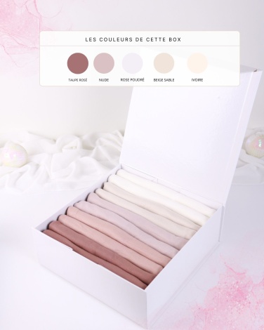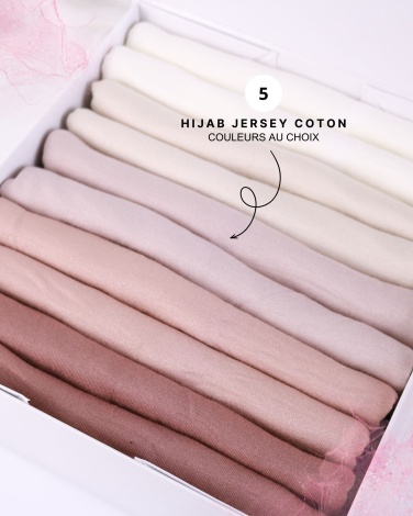 Create your XL Hijab Box with an exclusive collection of 5 jersey hijabs, an ideal option to spoil a Muslim veiled woman. Each jersey hijab embodies the union of comfort and elegance, offering a diverse color palette to complement your hijabi's style. Offer the Muslim veiled woman the opportunity to vary her looks with this XL Box, a meticulously crafted gift to enhance every occasion in her life.