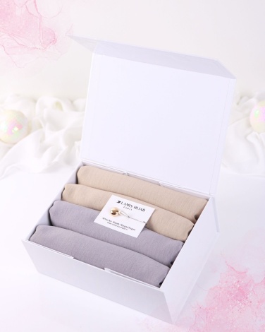 Explore our budget-friendly set, a lovely gesture for your favorite hijabi. It includes two hijabs of her choice, along with a set of accessories (Magnetic Hijab Clips/ Anti-Hole Hijab Set). It's a simple yet heartfelt gift for a hijabi woman, a special way to show how much she is appreciated.