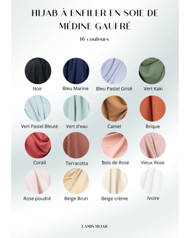 Le hijab à enfiler en soie de médine gaufré, est pratique et parfait pour le quotidien ou les occasions. il est composé d'un bonnet intégré à nouer et d'un châle long en soie de médine. L'ensemble est rattaché. le tissu de ce hijab à enfiler est particulièrement différent de notre collection des hijabs en soie de médine car il est légèrement élastique (Flexible) et infroissable.