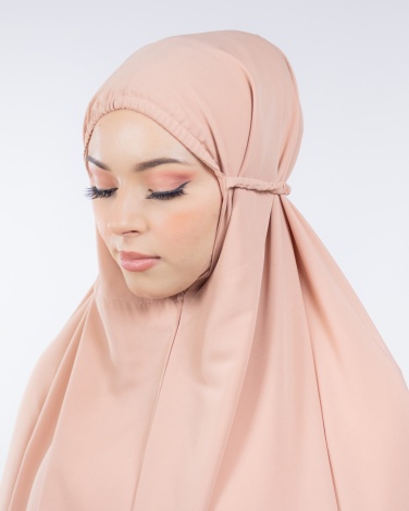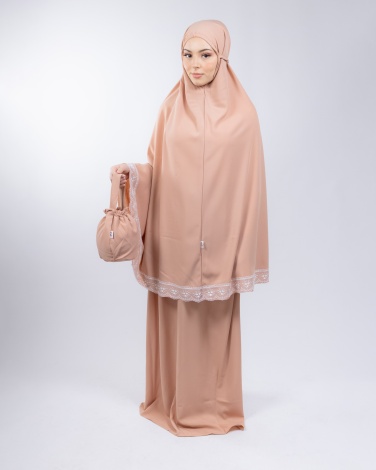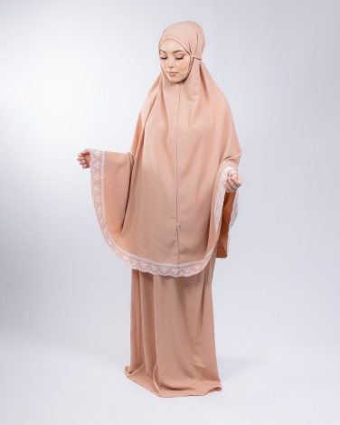 Ensemble de prière 3 pièces, composé d'une jupe taille élastique de 110 cm de longueur, d'un grand hijab à enfiler avec une ouverture de tête extensible qui s'adapte à toutes les formes et tailles de têtes, le haut fait 110 cm de long également il couvre entièrement les bras pendant la Salât et d'une bourse pour ranger l'ensemble lors d'un voyage ou un déplacement.