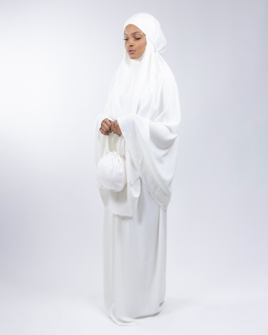 L'ensemble de prière est en tissu PRADA de haute qualité, c'est une matière particulièrement douce, fluide, opaque et nécessite peu d'entretien.