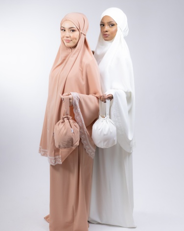 Ensemble de prière 3 pièces, composé d'une jupe taille élastique de 110 cm de longueur, d'un grand hijab à enfiler avec une ouverture de tête extensible qui s'adapte à toutes les formes et tailles de têtes, le haut fait 110 cm de long également il couvre entièrement les bras pendant la Salât et d'une bourse pour ranger l'ensemble lors d'un voyage ou un déplacement.
