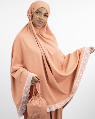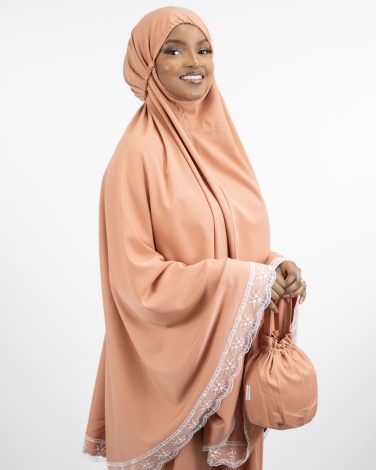 Ensemble de prière 3 pièces, composé d'une jupe taille élastique de 110 cm de longueur, d'un grand hijab à enfiler avec une ouverture de tête extensible qui s'adapte à toutes les formes et tailles de têtes, le haut fait 110 cm de long également il couvre entièrement les bras pendant la Salât et d'une bourse pour ranger l'ensemble lors d'un voyage ou un déplacement.
