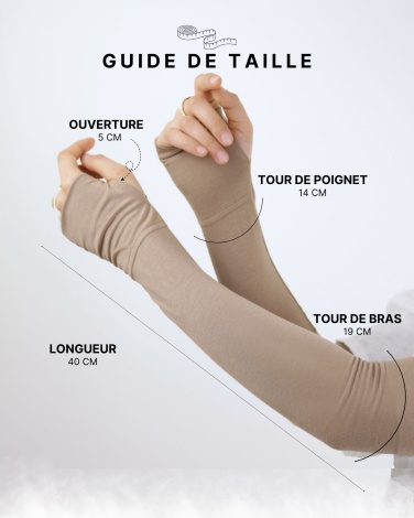 ✅ Tour de poignet : 14 cm / Tour de bras : 19 cm / Ouverture pour le doigt : 5 cm (tissu extensible).