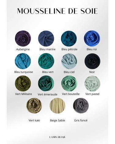 La mousseline de soie est un tissu léger et aérée avec un touchée texturé. Cette matière a une opacité de 80%. Pour garantir une couverture optimale, nous conseillons de porter un sous-hijab, de préférence une cagoule, un bonnet ferméou un sous hijab intérieur satin de soie. La mousseline de soie contient de la soie artificielle, apprécié pour sa finesse, sa douceur et sa fluidité. La mousseline de soie peut également être teinte dans une variété de couleurs, ce qui permet de créer des pièces à la fois intemporelles et modernes. Ce type de hijab convient aux hijabi qui apprécient le confort et l'élégance sans avoir chaud.