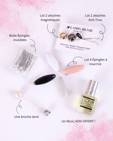 Explorez une gamme diversifiée d'épingles hijab délicates et de broches ornées de perles pour compléter votre style avec raffinement. Notre box d'accessoires hijab vise à répondre aux besoins de chaque hijabi dans toutes situations. En cadeau, profitez d'un musc ADN offert, ajoutant un parfum envoûtante à votre expérience.