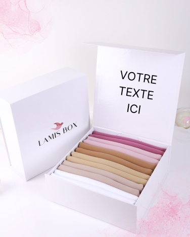 Chez Lamis Hijab, notre engagement envers vous se traduit par l'offre des plus hautes qualités. Ainsi, chaque produit est soigneusement emballé dans une boîte, pelliculée et brillante, conçue en carton rigide de première qualité. Nous sommes fiers de souligner que chaque boîte est unique grâce à une personnalisation spécialement choisie par vos soins.
