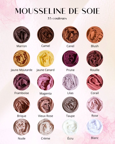 La mousseline de soie, un tissu léger au toucher texturé, offre une opacité de 80%. Pour assurer une couverture optimale, il est recommandé de porter un sous-hijab, de préférence une cagoule, un bonnet fermé ou un sous-hijab intérieur satin de soie. Composée de soie artificielle, la mousseline de soie séduit par sa finesse, sa douceur et sa fluidité. Sa capacité à être teinte dans différentes couleurs permet la création de pièces à la fois intemporelles et modernes. Ce type de hijab convient parfaitement aux hijabis recherchant le confort et l'élégance sans compromettre la légèreté.