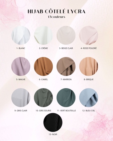 Les couleurs sur la photo sont : Blanc, Crème, Beige, Rose poudré, Mauve, Brique, Camel et Marron