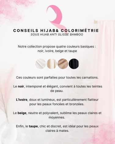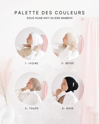✨ Disponible en noir, ivoire, beige et taupe, il se coordonne parfaitement avec notre hijab en bambou pour créer des ensembles élégants et pratiques. Ces couleurs basiques sont choisies pour leur capacité à compléter toutes les carnations et à s'harmoniser avec une multitude de tenues.