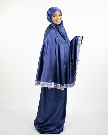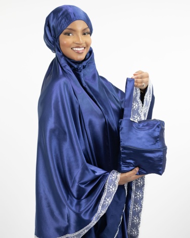 - un hijab à enfiler de 110 cm de long doté d'attaches pour ajuster le hijab selon la taille de tête et d'un cache menton.